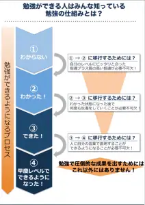 勉強ができるようにならない生徒の場合、②わかった!⇒③できた!に移行する際に問題点があります。